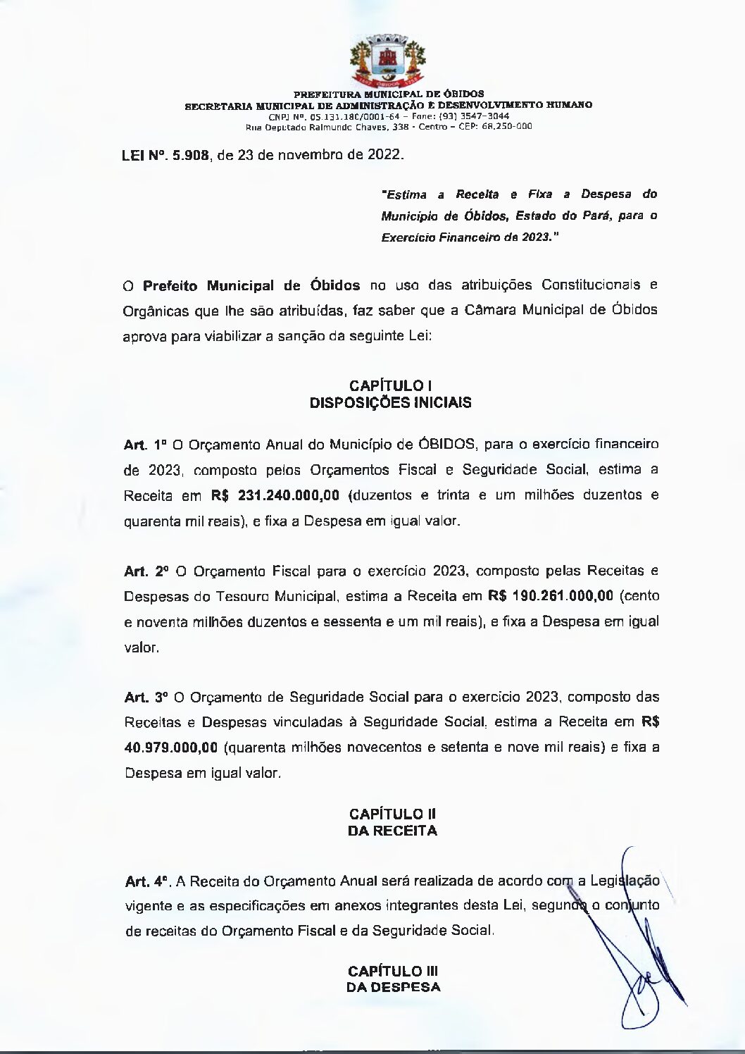 5.908 – ESTIMA A RECEITA E FIXA A DESPESA DO MUNICIPIO LOA 2023